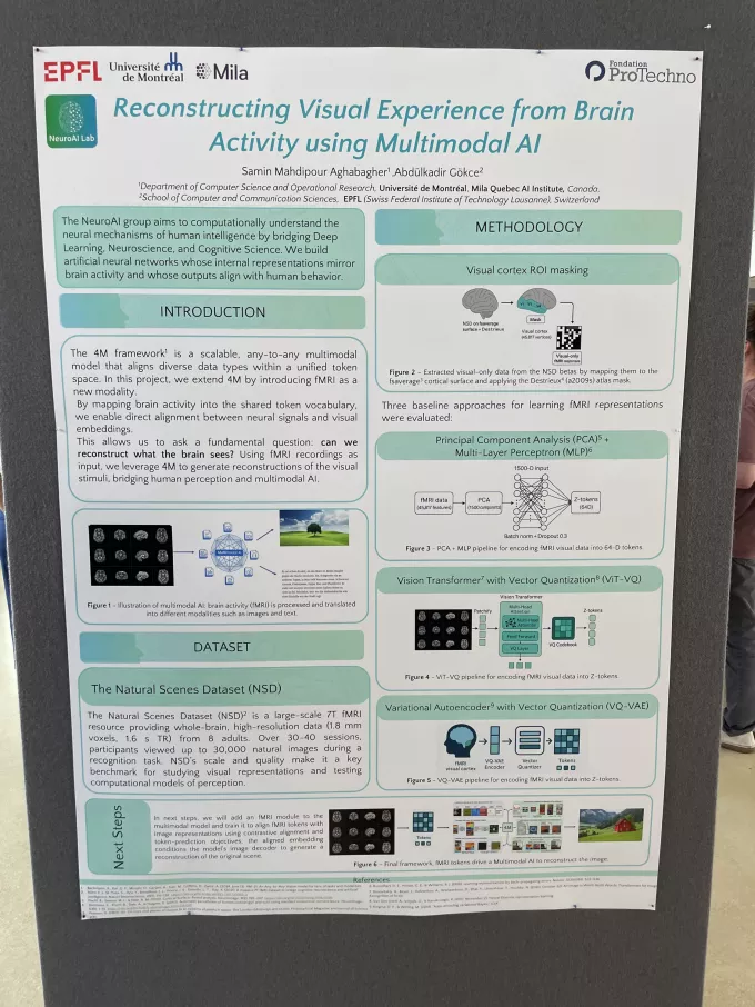 The symposium showcased a wide array of research projects — from structural biology to brain–computer interfaces. One standout was a team working on Reconstructing Visual Experience From Brain Activity, where the group is exploring the use of fMRI recordings and tokenized brainwave data to train multimodal AI models capable of generating visual reconstructions from neural data.